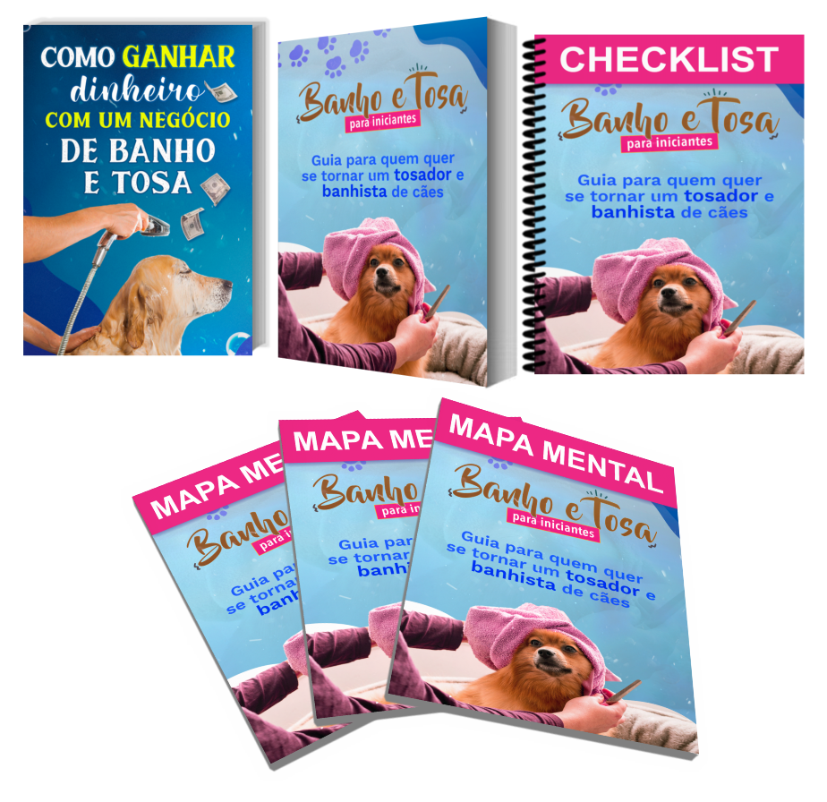 É um guia de treinamento passo a passo para ajudar você a montar seu negócio de banho e tosa, onde dou todos os detalhes necessários e toda instrução. Da forma como esse guia foi desenhado, você vai poder colocar tudo em prática na velocidade que escolher, por isso, não importa se você tem poucas horas no seu dia, ou o dia inteiro para começar.